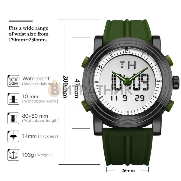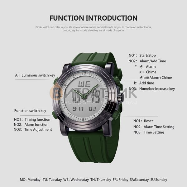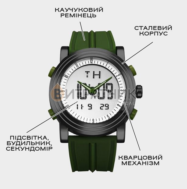 Функції:Будильник. подсветка. секундомер. дата. день недели. месяц
