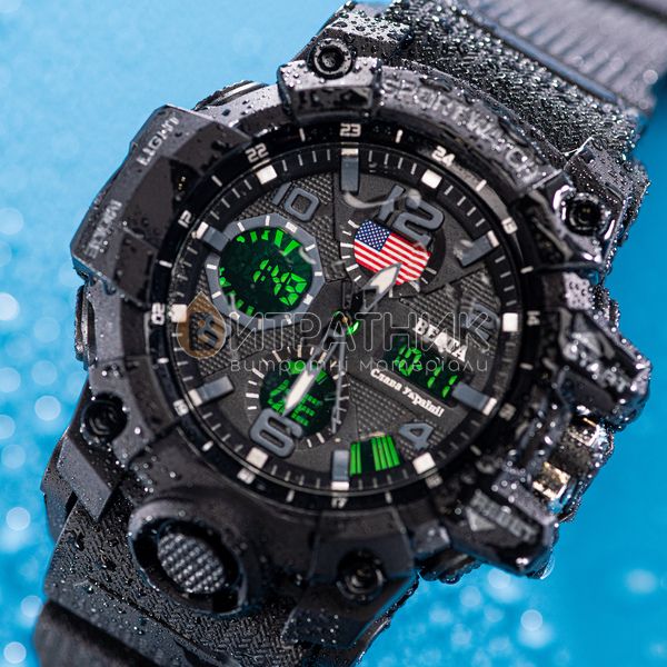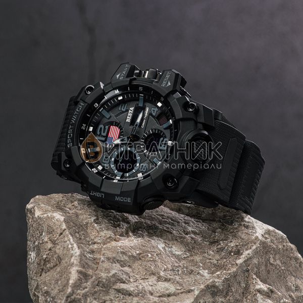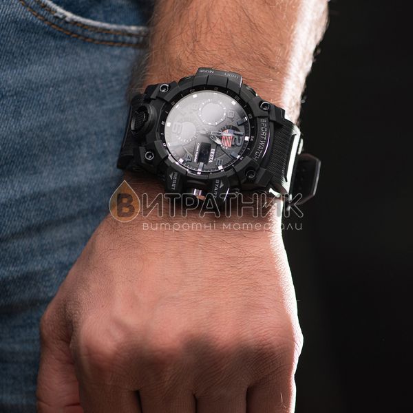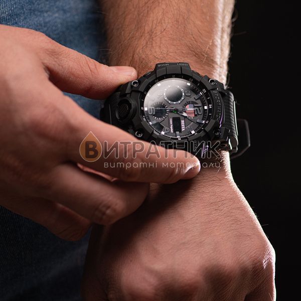 Функції:Секундомір, будильник, підсвічування, час показується на циферблаті і стрілками, дата, день тижня, місяць