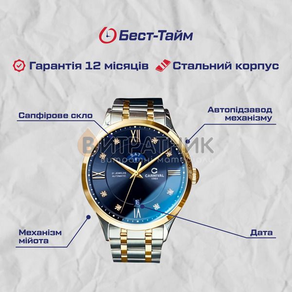 Дизайнери бренду Carnival приділили особливу увагу створенню циферблата. Колір моделі підібраний досить скрупульозно, щоб індекси / цифри відображалися на ньому максимально чітко та контрастно. Корпус виготовлений з міцного і зносостійкого матеріалу, який під впливом несприятливих факторів не втрачає своїх властивостей. Це означає, що ви зможете його носити стільки, скільки забажаєте. Аксесуар доповнений якісним ремінцем із класичною застібкою, яка регулюється. Він приємний на дотик, а при тривалому носінні не деформується й не псується. З огляду на такі характеристики вам просто необхідно купити чоловічий годинник Carnival Shato Men, щоб залишатися у тренді, а головне, завжди підкреслювати авторитетність своєї персони у будь-якому суспільстві.
