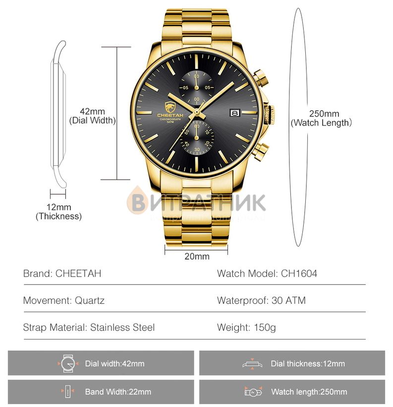 Стильний чоловічий годинник Cheetah Mars Gold відзначається оригінальним дизайном. Прямі лінії, гострі краї та ексклюзивно зроблений корпус додають виробу розкішного вигляду. Завдяки такому аксесуарові ви матимете унікальну можливість правильно розставити акценти у створеному вами образі. До того ж вам достатньо лише підняти руку, аби щось показати, як очі всіх присутніх будуть прикуті до вашого елегантного годинника.