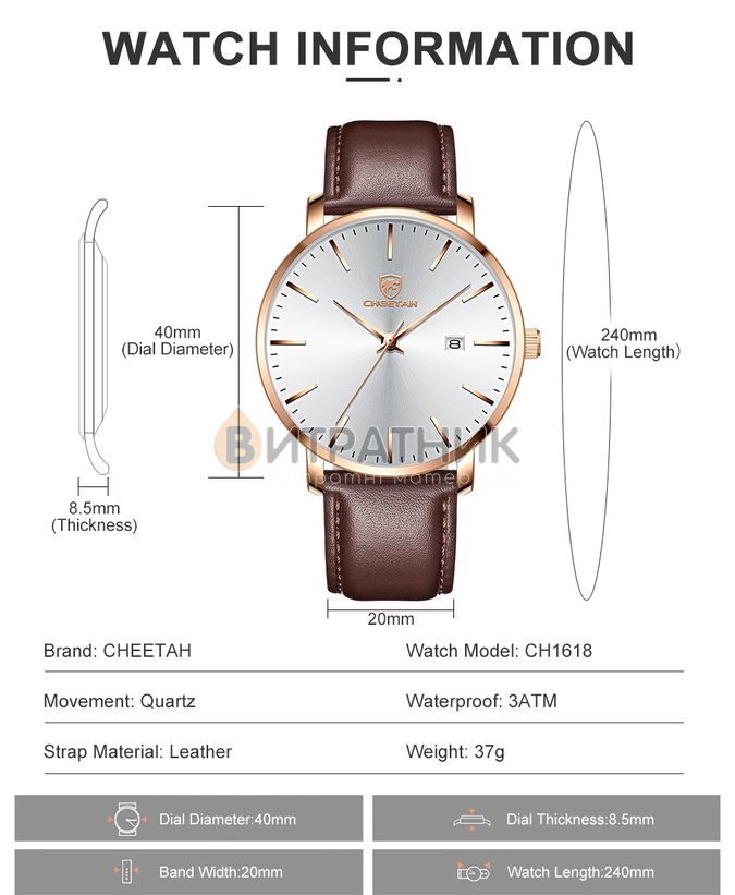 Стильний чоловічий годинник Cheetah Time відзначається оригінальним дизайном. Прямі лінії, гострі краї та ексклюзивно зроблений корпус додають виробу розкішного вигляду. Завдяки такому аксесуарові ви матимете унікальну можливість правильно розставити акценти у створеному вами образі. До того ж вам достатньо лише підняти руку, аби щось показати, як очі всіх присутніх будуть прикуті до вашого елегантного годинника.