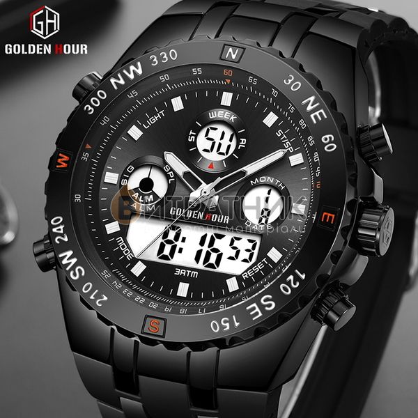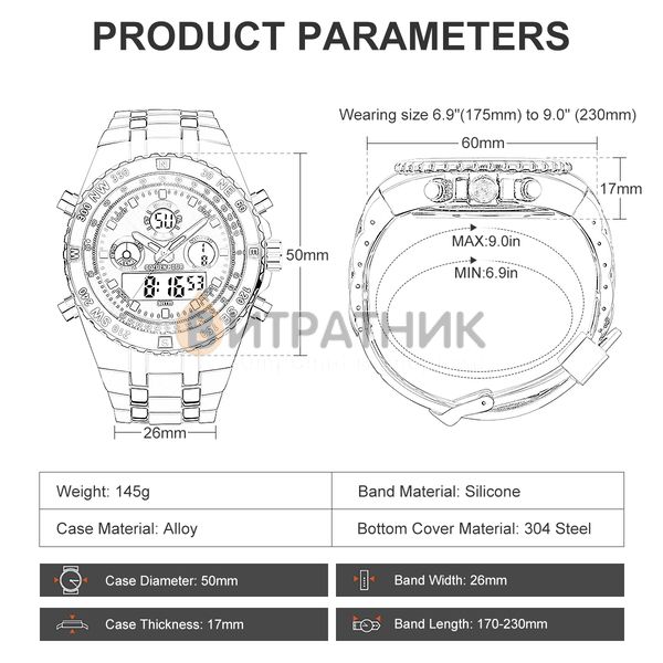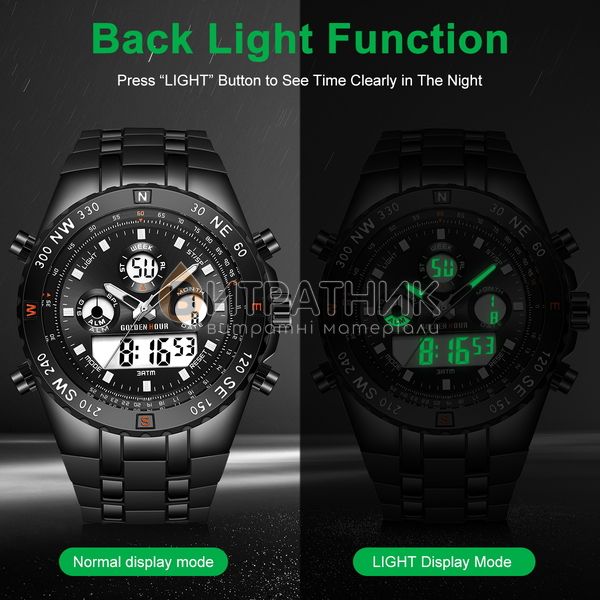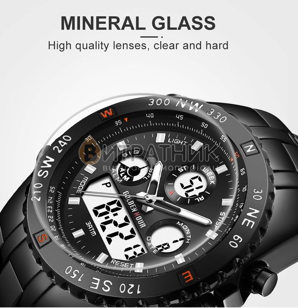 Функції:Подвійний час, будильник, підсвічування, секундомір, дата, день тижня, місяць