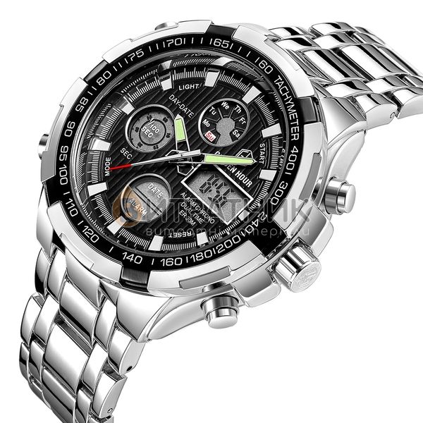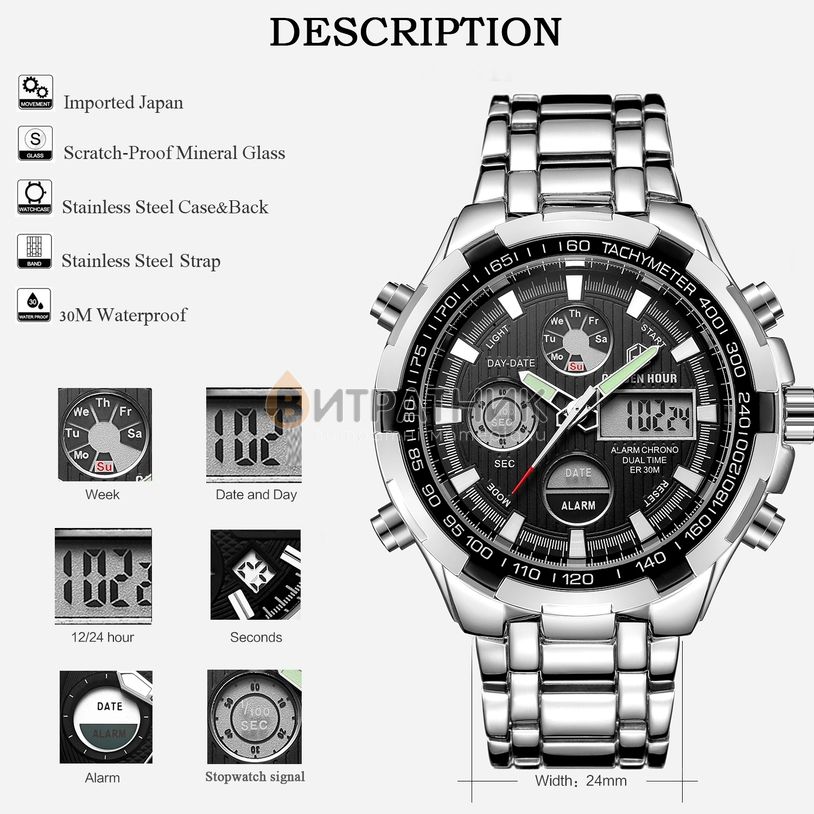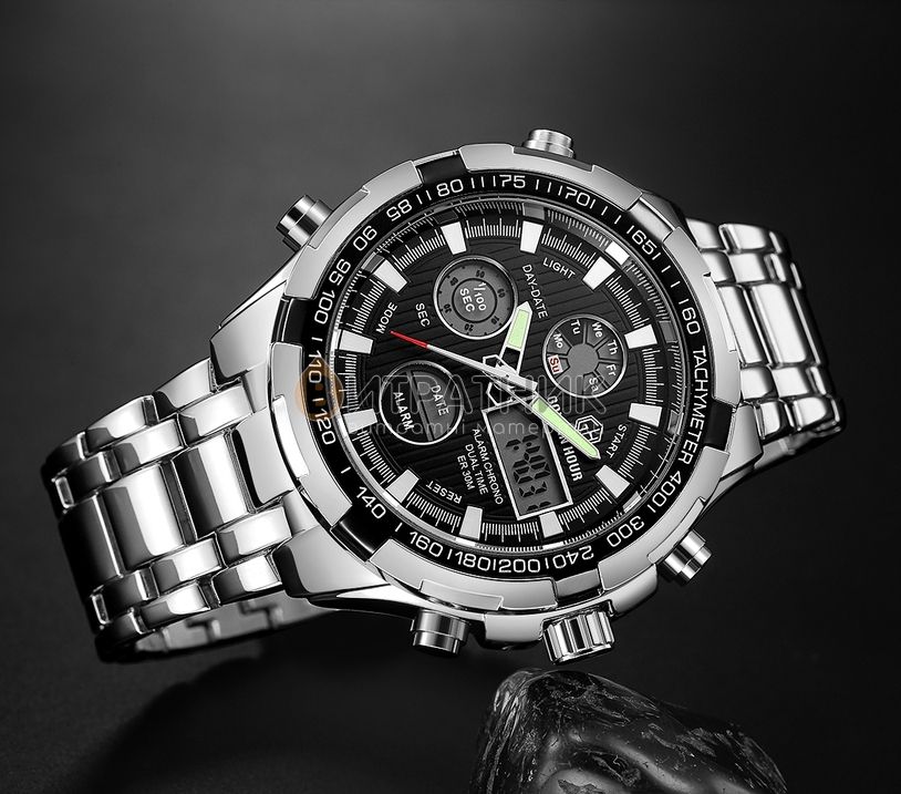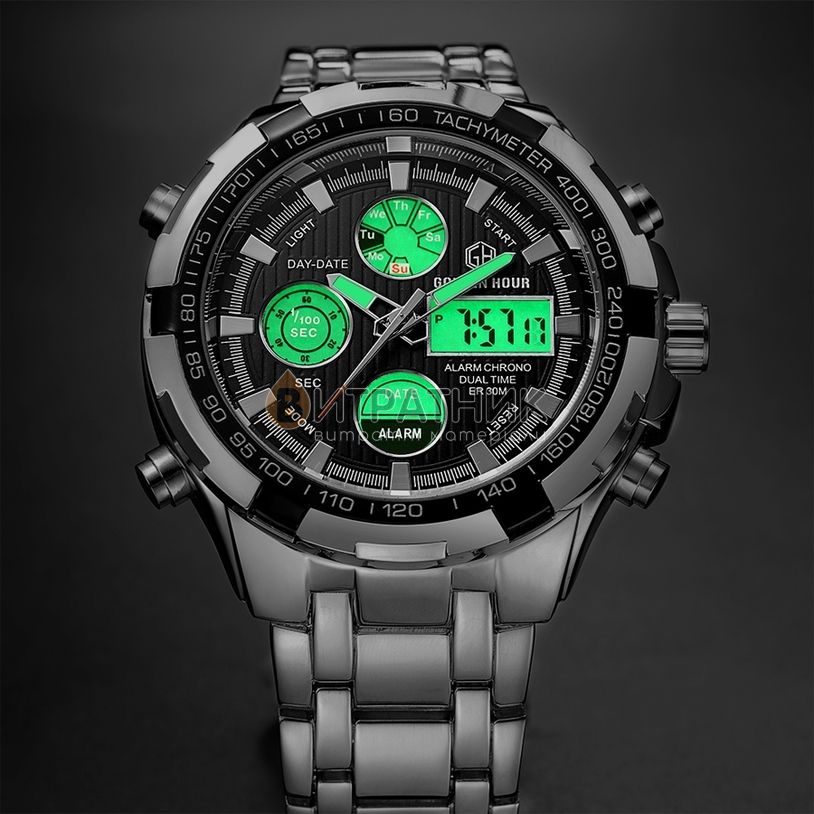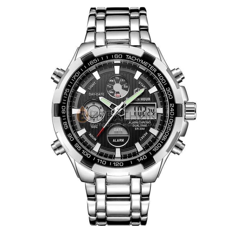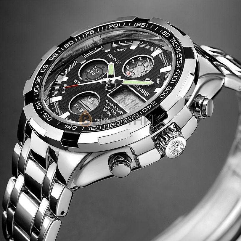Стильний чоловічий годинник GoldenHour Titan відзначається оригінальним дизайном. Прямі лінії, гострі краї та ексклюзивно зроблений корпус додають виробу розкішного вигляду. Завдяки такому аксесуарові ви матимете унікальну можливість правильно розставити акценти у створеному вами образі. До того ж вам достатньо лише підняти руку, аби щось показати, як очі всіх присутніх будуть прикуті до вашого елегантного годинника.