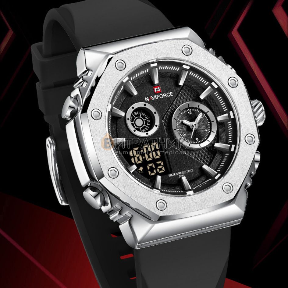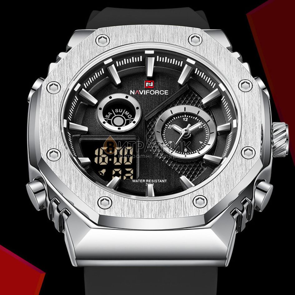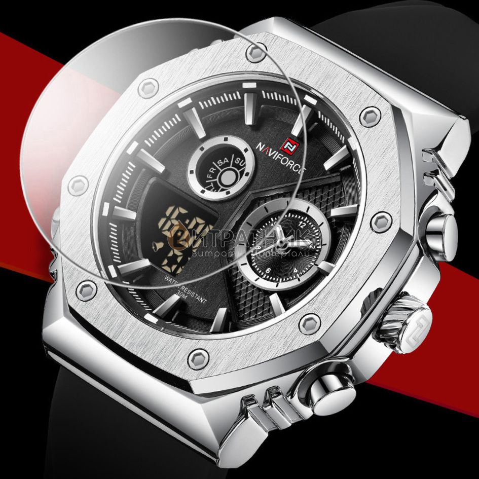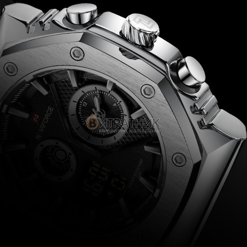 Стильний чоловічий годинник Naviforce Charger відзначається оригінальним дизайном. Прямі лінії, гострі краї та ексклюзивно зроблений корпус додають виробу розкішного вигляду. Завдяки такому аксесуарові ви матимете унікальну можливість правильно розставити акценти у створеному вами образі. До того ж вам достатньо лише підняти руку, аби щось показати, як очі всіх присутніх будуть прикуті до вашого елегантного годинника.