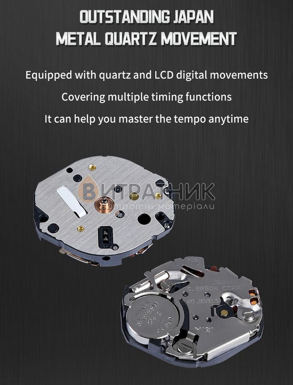 Функції:Будильник, підсвічування, секундомір, час показується на циферблаті й стрілками, дата, день тижня, місяць