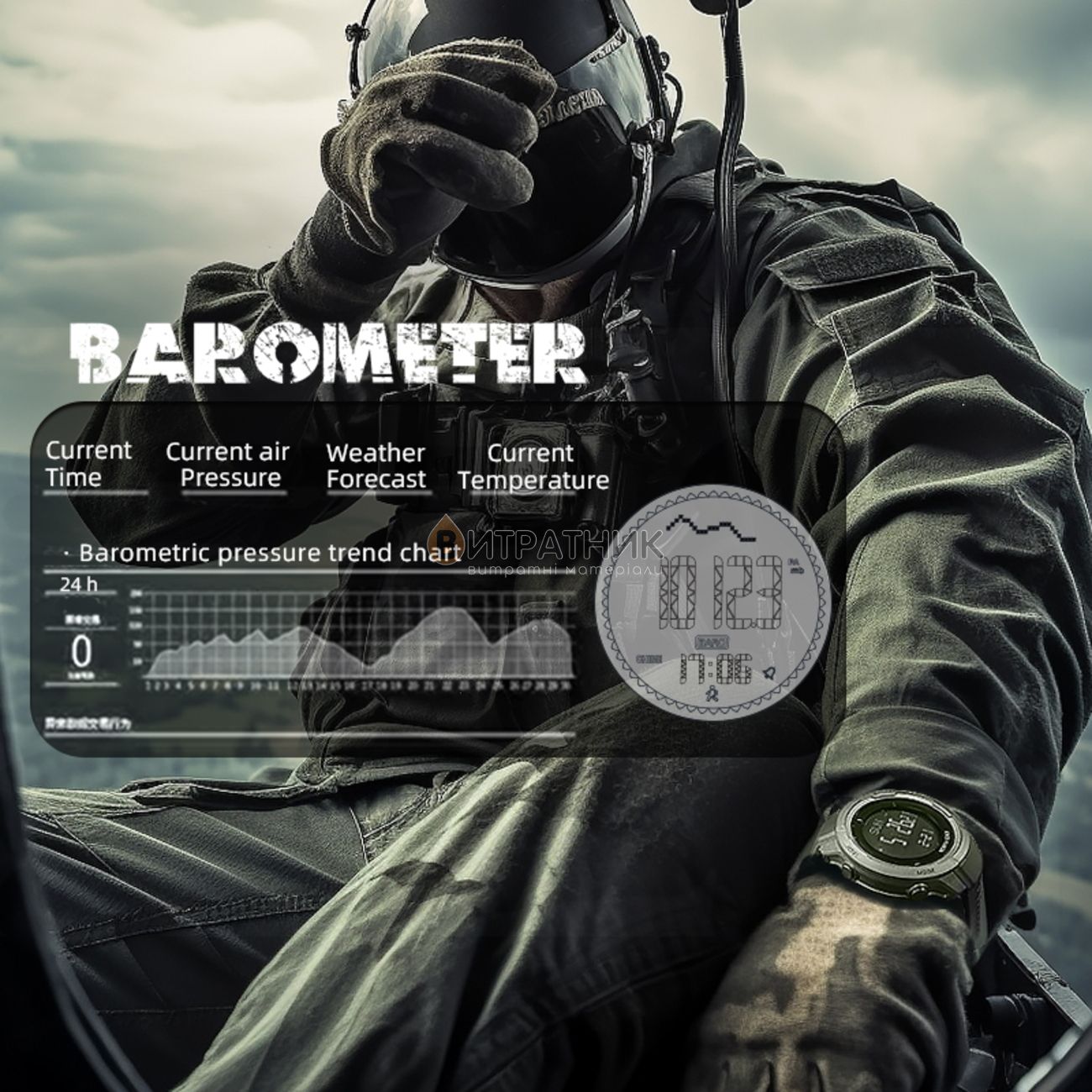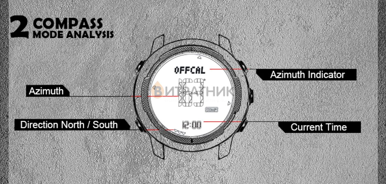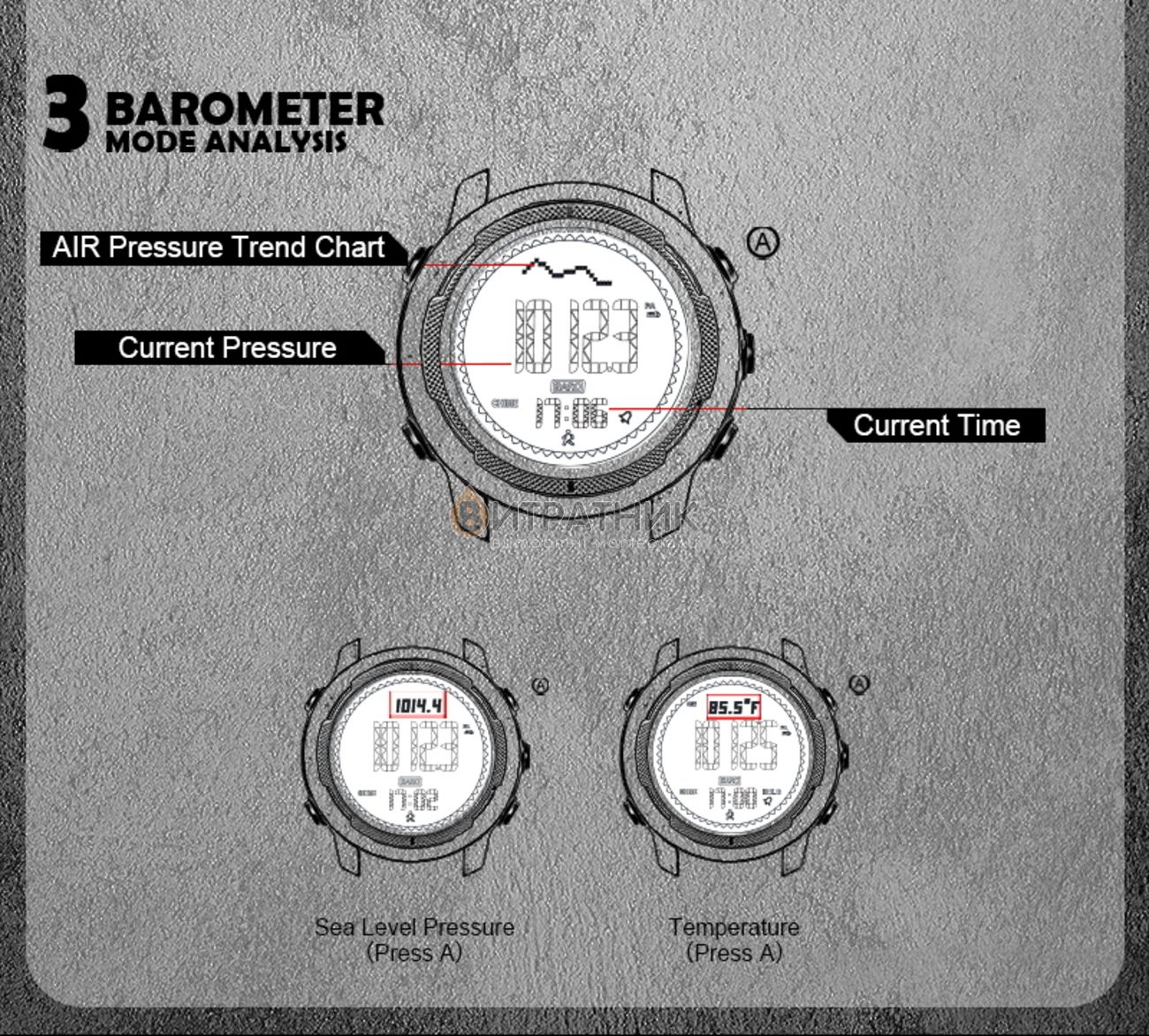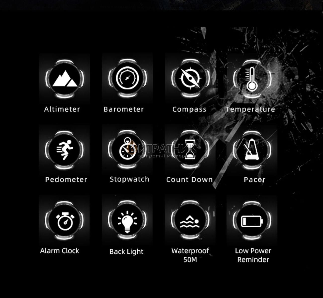 Функції:Компасс. водостойкость 5 атм. альтметр. барометр. педометр. калорий. дистанции. секундомер. подсветка. будильник. Таймер.