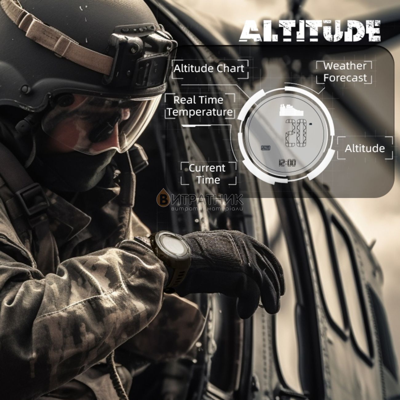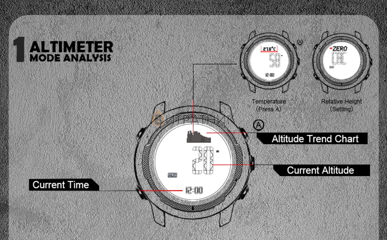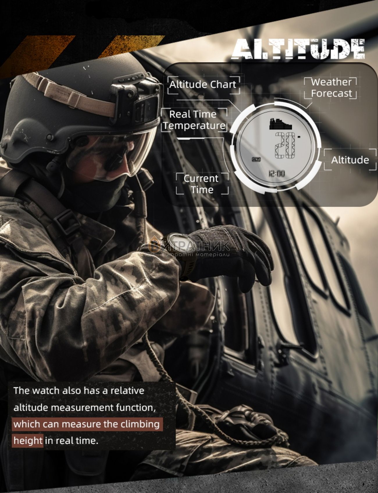 Функції:Компасс. водостойкость 5 атм. альтметр. барометр. педометр. калорий. дистанции. секундомер. подсветка. будильник. Таймер.