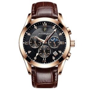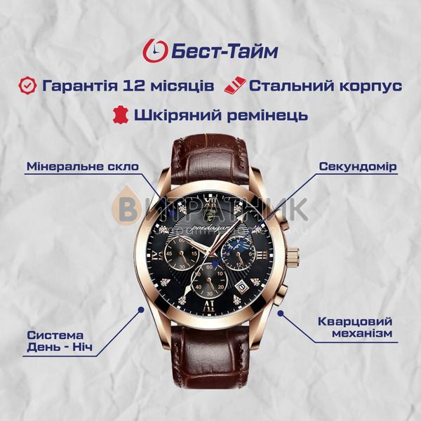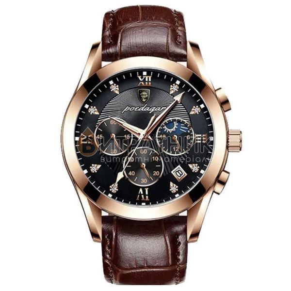 Дизайнери бренду Poedagar приділили особливу увагу створенню циферблата. Колір моделі підібраний досить скрупульозно, щоб індекси / цифри відображалися на ньому максимально чітко та контрастно. Корпус виготовлений з міцного і зносостійкого матеріалу, який під впливом несприятливих факторів не втрачає своїх властивостей. Це означає, що ви зможете його носити стільки, скільки забажаєте. Аксесуар доповнений якісним ремінцем із класичною застібкою, яка регулюється. Він приємний на дотик, а при тривалому носінні не деформується й не псується. З огляду на такі характеристики вам просто необхідно купити чоловічий годинник Poedagar Magnat Gold, щоб залишатися у тренді, а головне, завжди підкреслювати авторитетність своєї персони у будь-якому суспільстві.