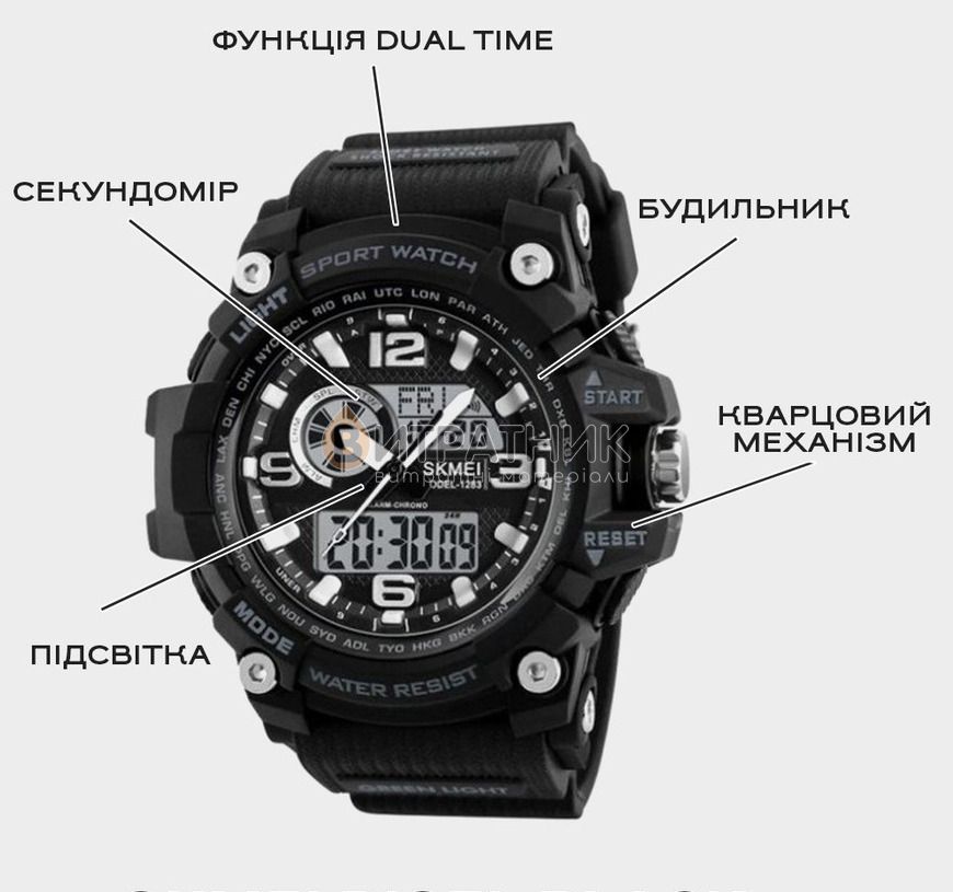 Функції:Секундомер. Таймер. будильник. подсветка. время указывается на циферблате и стрелками. дата. день недели. месяц. второе время (Dual Time)