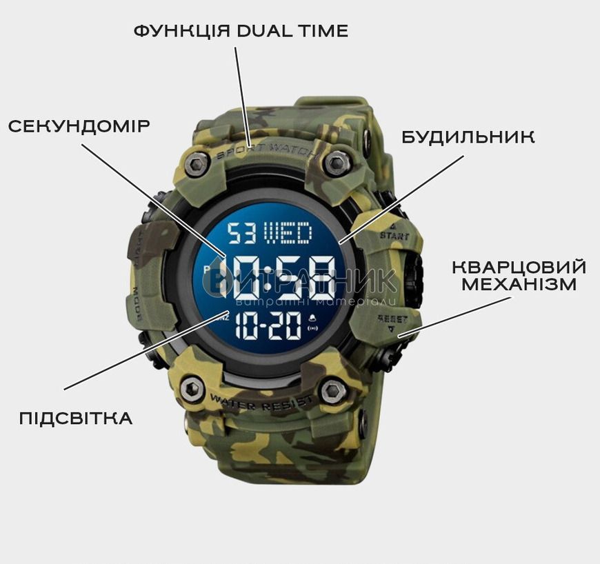 Функції:Секундомер. будильник. Таймер. подсветка. дата. день недели. месяц. второе время (Dual Time)
