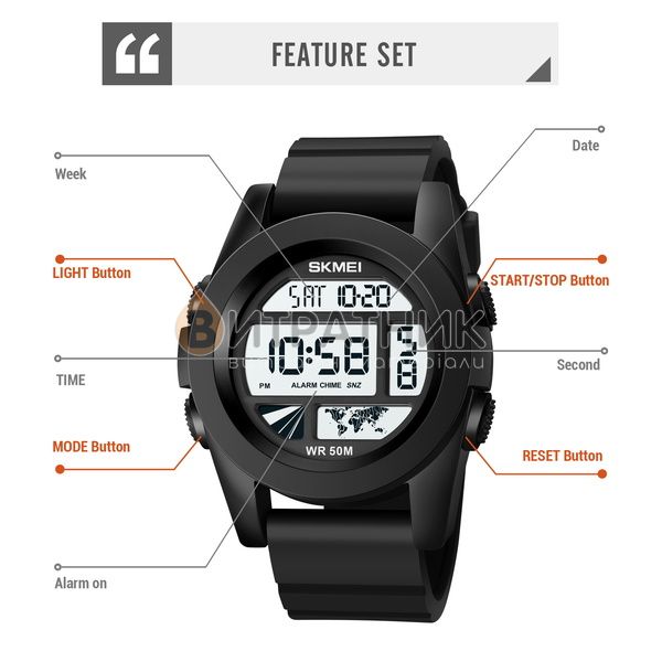 Функції:Секундомер. будильник. Таймер. подсветка. дата. день недели. месяц. второе время (Dual Time)