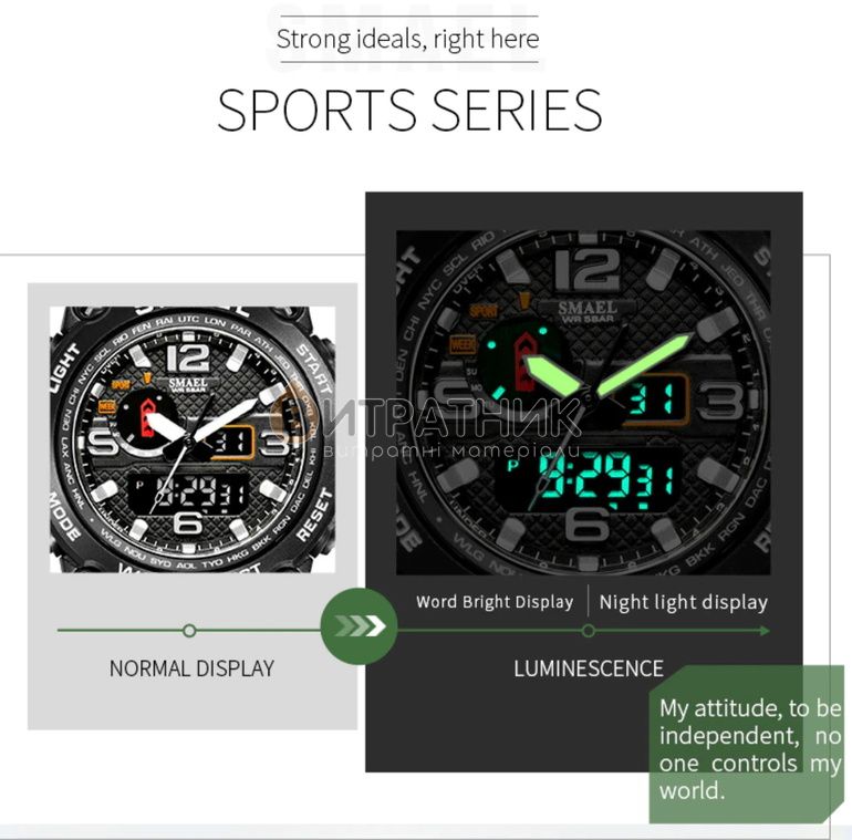 Функції:Двойное время. 2 механизма. секундомер. будильник. подсветка. дата. день недели. месяц