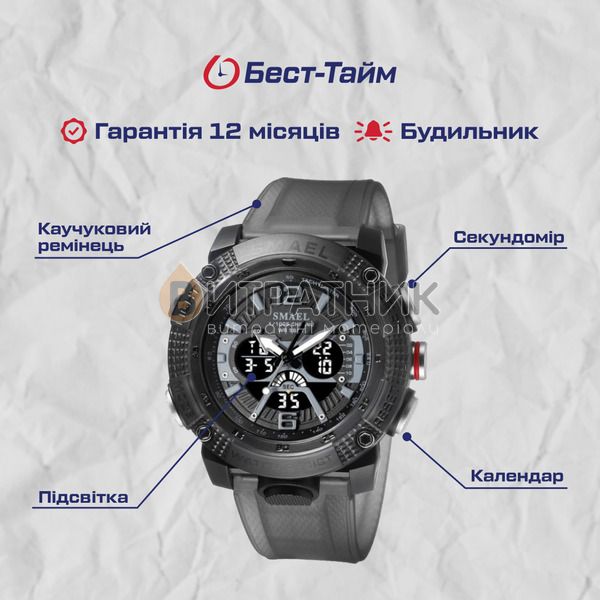 Стильний чоловічий годинник Smael Tornado відзначається оригінальним дизайном. Прямі лінії, гострі краї та ексклюзивно зроблений корпус додають виробу розкішного вигляду. Завдяки такому аксесуарові ви матимете унікальну можливість правильно розставити акценти у створеному вами образі. До того ж вам достатньо лише підняти руку, аби щось показати, як очі всіх присутніх будуть прикуті до вашого елегантного годинника.