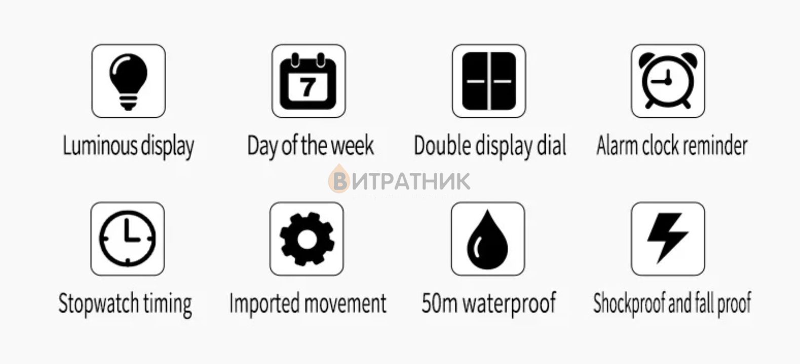 Функції:Двойное время. 2 механизма. секундомер. будильник. подсветка. дата. день недели. месяц