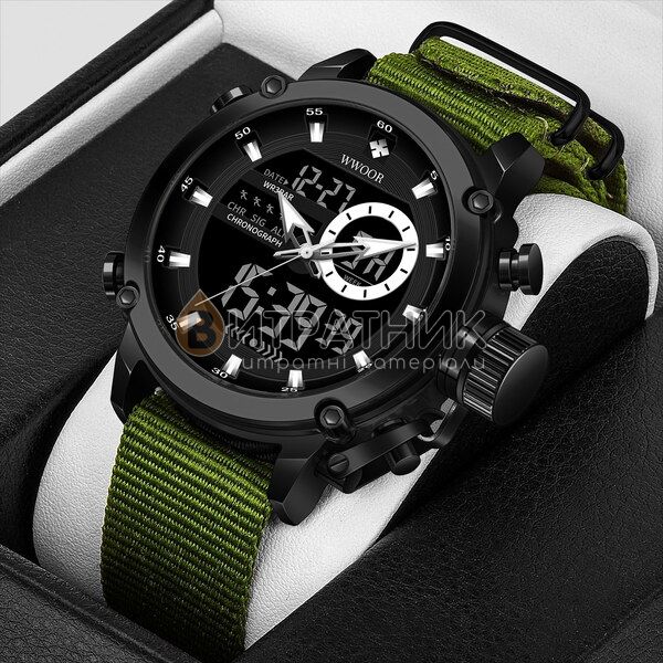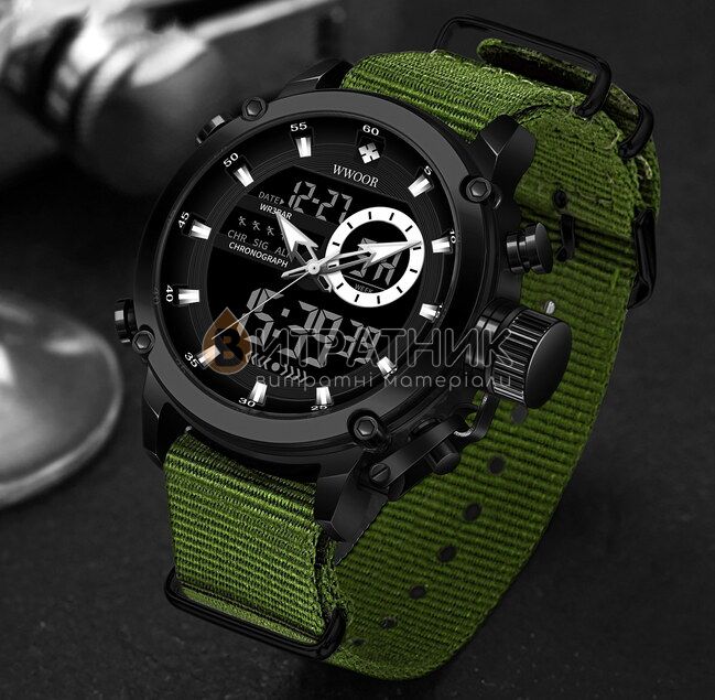 Дизайнери бренду Wwor приділили особливу увагу створенню циферблата. Колір моделі підібраний досить скрупульозно, щоб індекси / цифри відображалися на ньому максимально чітко та контрастно. Корпус виготовлений з міцного і зносостійкого матеріалу, який під впливом несприятливих факторів не втрачає своїх властивостей. Це означає, що ви зможете його носити стільки, скільки забажаєте. Аксесуар доповнений якісним ремінцем із класичною застібкою, яка регулюється. Він приємний на дотик, а при тривалому носінні не деформується й не псується. З огляду на такі характеристики вам просто необхідно купити чоловічий годинник Wwor Strike Green, щоб залишатися у тренді, а головне, завжди підкреслювати авторитетність своєї персони у будь-якому суспільстві.