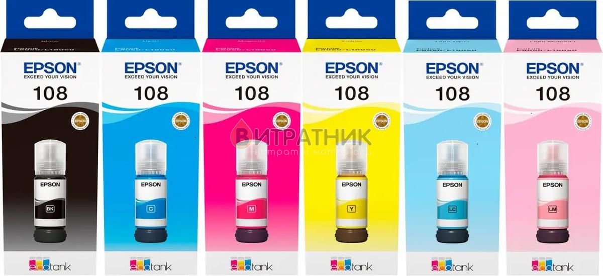 - Набір оригінальних чорнил Epson для L18050/L8050 №108 6шт x 70мл B/C/M/Y/LC/LM