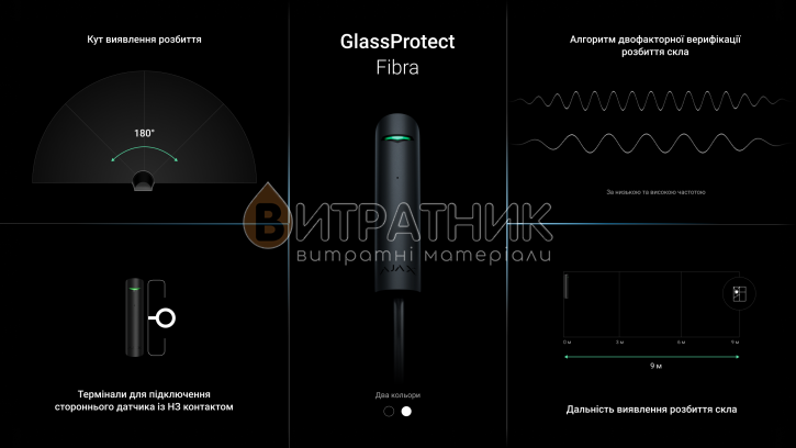 Дротовий датчик розбиття скла Ajax GlassProtect Fibra Black забезпечить надійний захист вашій оселі та комерційним приміщенням. Зазвичай зловмисники обирають саме вікна для проникнення на приватну територію. Тепер у них немає шансів залишитися без покарання та втекти з повними руками. Декілька секунд — і ви та охоронна бригада будуть знати про акт вандалізму чи пограбування. Унікальність цього пристрою полягає в тому, що він здатний розпізнати розбиття скла на відстані 9 м. Якщо вам потрібно пильнувати своє майно чи бізнес, тоді обирайте саме ці пристосування для охоронної сигналізації.