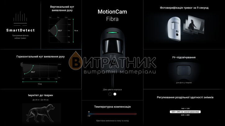 Принцип роботи детектора полягає в тому, що він миттєво реагує на присутність людей. Для цього в ньому встановлена лінза Френеля, котру розробили спеціально для відтворення максимально інформативних теплових діаграм. Завдяки програмному алгоритму SmartDetect пристрій фільтрує хибні тривоги, розрізняючи тварин від людей. Тільки при правильному встановленні можна досягти такого надточного детектування. В залежності від ваших потреб та цілей купити Дротовий датчик руху з фотоверифікацією Ajax MotionCam Fibra Black варто з таких вагомих причин: