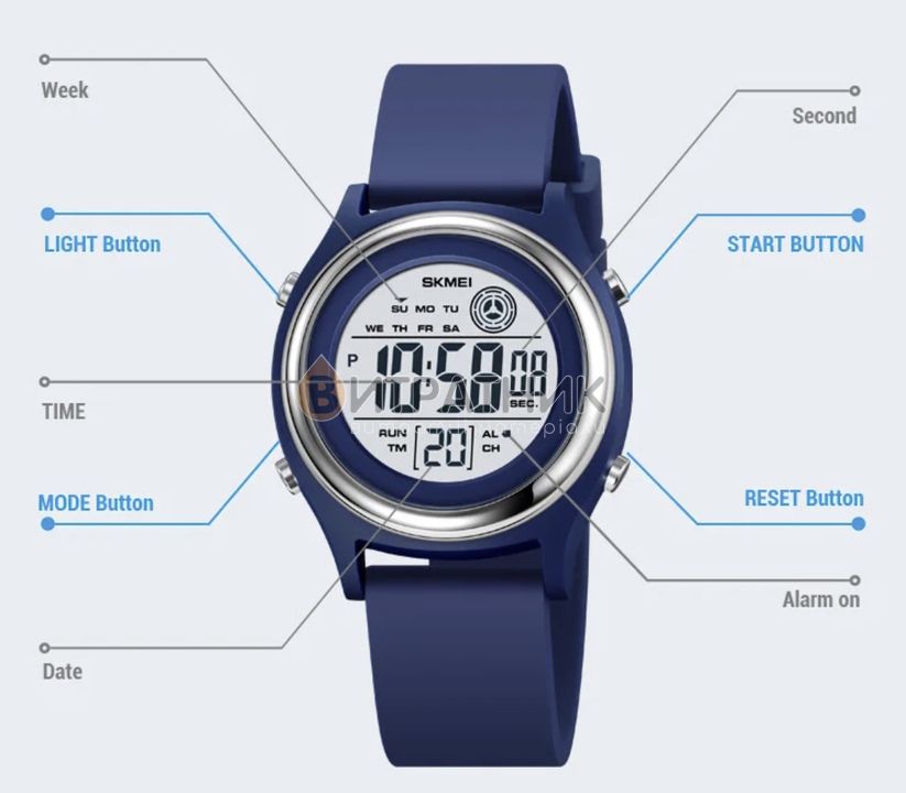 Функції:Секундомер. будильник. дата. день недели. месяц