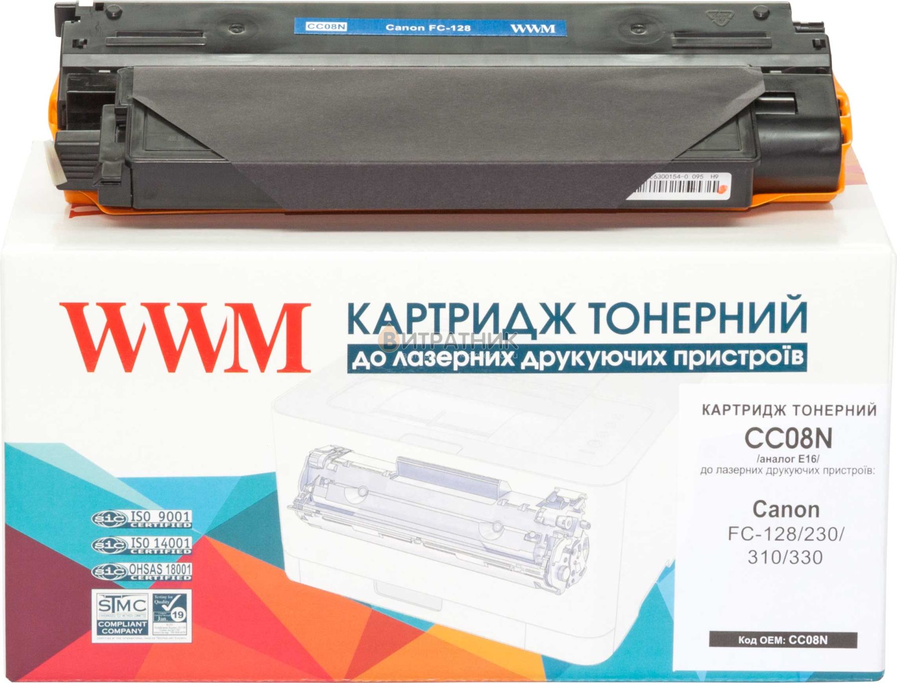 Норма друку сумісного картриджа тонерный WWM для Canon FC-128/230/310/330 аналог E16 Black (CC08N) для сторінок А4 з заповненням 5% становить 2000 аркушів.