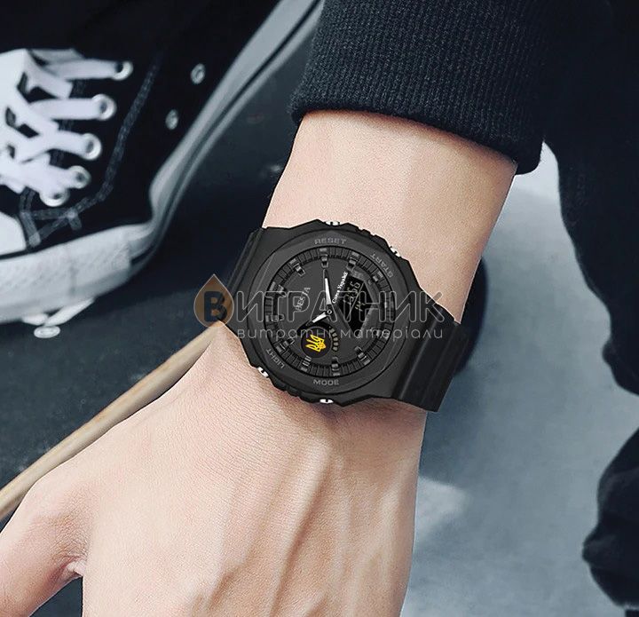 Функции:Секундомер, будильник, подсветка, время показывается на циферблате и стрелками, дата, день недели, месяц