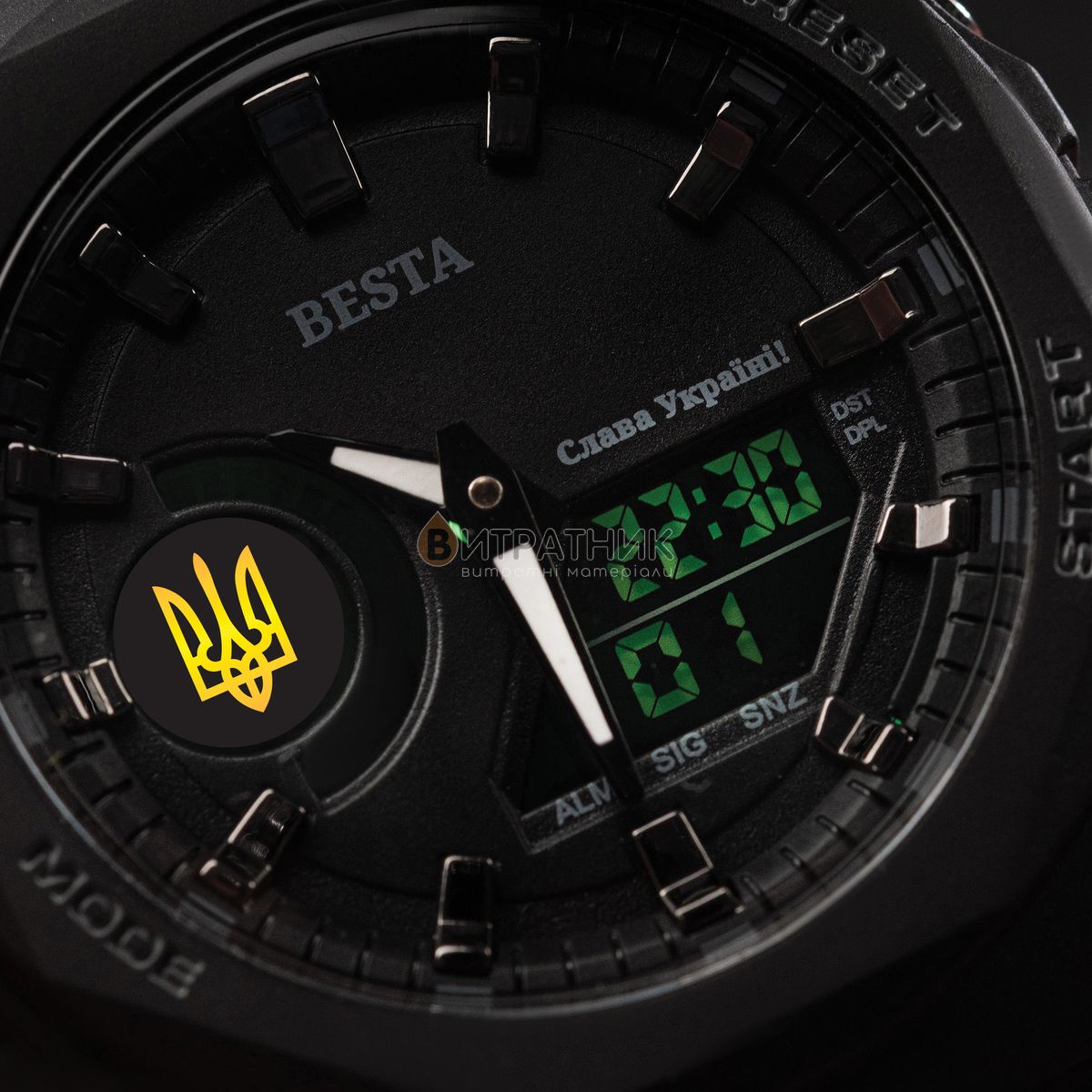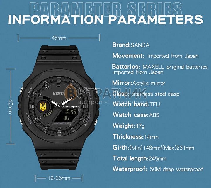 Besta – це молодий український бренд якісних годинників. Годинник має витончений дизайн та якісний японський механізм. Він розроблений спеціально для важких умов, витримує підвищені навантаження, холод до -30 та потрапляння води до 3-х метрів. Проєктування, розробка та головний офіс бренду знаходяться в Україні, збірка відбувається в Китаї, що дає змогу забезпечити найкращу ціну при високій якості.На задній стороні годинника виконане витончене гравіювання Героям Слава і тризуб!❤В комплекті йде офіційна гарантія на 12 місяців.