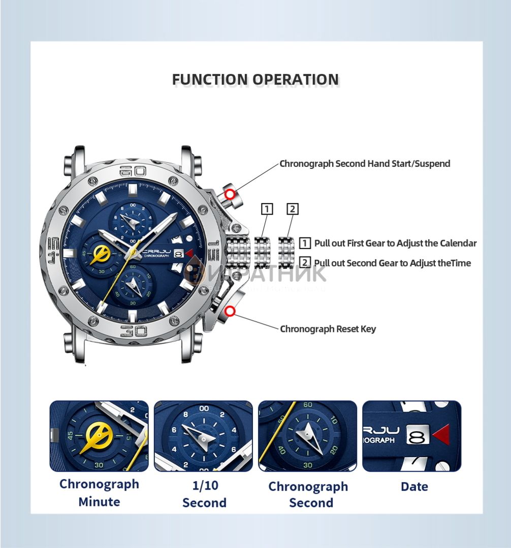 Функции:Хронограф. секундомер. дата. время по 24-й шкале