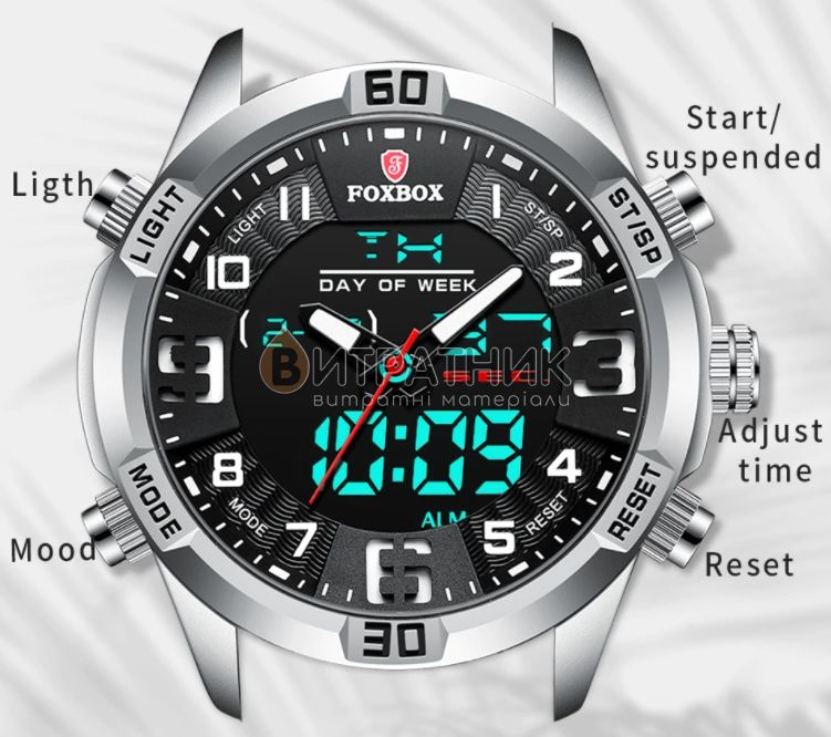 Функции:Секундомер. будильник. подсветка. время указывается на циферблате и стрелками. дата. день недели. месяц