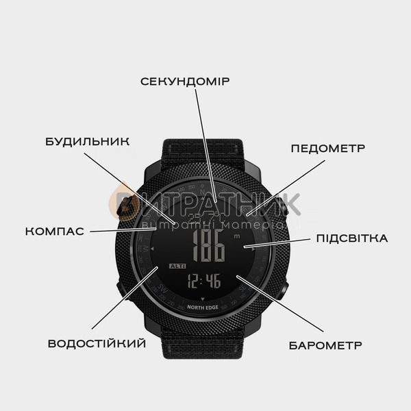 North Edge - це бренд тактичних годинників, які спеціально розроблені для військових, пілотів, моряків і т.д., які працюють в надскладних умовах. Ці годинники призначені для використання в екстремальних ситуаціях, де точність, надійність та функціональність є критичними.Годинники від бренду North Edge можуть витримувати ультрахолодні температури, а також мають в собі важливі функції, такі як компас, альтиметр, будильник та інші. Бренд North Edge має репутацію надійних і якісних годинників.В комплекті йде безкоштовно змінний тканевий ремінець чорного кольору та офіційна гарантія на 12 місяців.