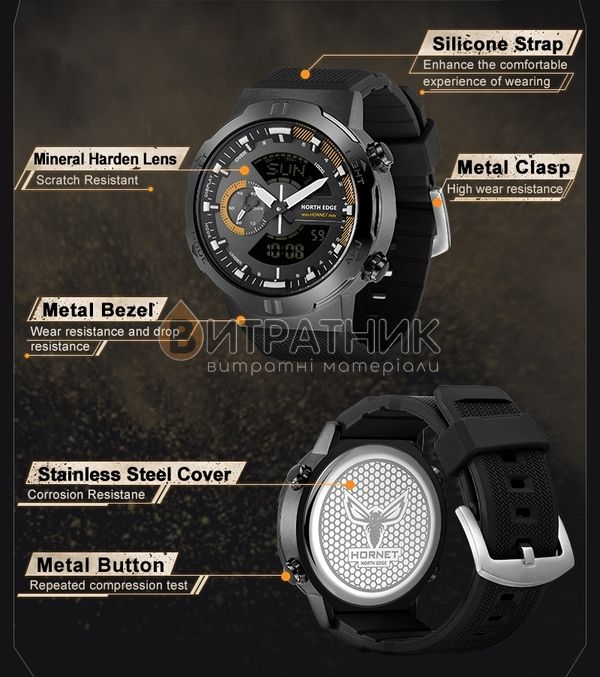 Дизайнеры бренда North Edge уделили особое внимание созданию циферблата. Цвет модели подобран достаточно скрупулезно, чтобы индексы/цифры отображались на нем максимально четко и контрастно. Корпус изготовлен из прочного и износостойкого материала, который под влиянием неблагоприятных факторов не теряет своих свойств. Это значит, что вы можете его носить столько, сколько пожелаете. Аксессуар дополнен качественным ремешком с регулируемой классической застежкой. Он приятен на ощупь, а при длительном ношении не деформируется и не портится. Учитывая такие характеристики, вам просто необходимо купить мужские часы North Edge Hornet, чтобы оставаться в тренде, а главное, всегда подчеркивать авторитетность своей персоны в любом обществе.