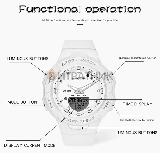 Функции:Секундомер. будильник. подсветка. время указывается на циферблате и стрелками. дата. день недели. месяц