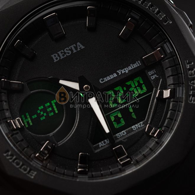 Функции:Секундомер. будильник. подсветка. время указывается на циферблате и стрелками. дата. день недели. месяц