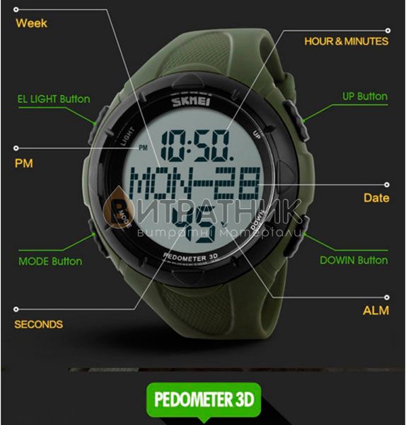 Функции:Таймер. шагомер. подсчет калорий секундомер. будильник. подсветка. дата. день недели. месяц