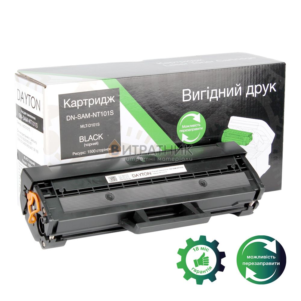 Норма печати совместимого картриджа DAYTON совместимый аналог Samsung MLT-D101S для страниц А4 с заполнением 5% составляет 1500 листов.