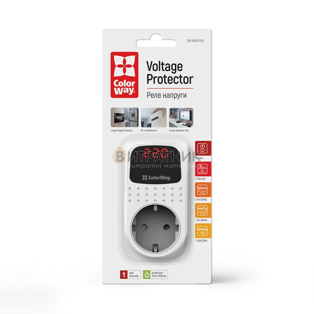 Реле напруги Сolorway – спеціальний пристрій захисту від перепадів напруги у мережі. Реле в режимі реального часу аналізує напругу мережі та автоматично вимикає підключену техніку від живлення при виході показників напруги на критичні позначки. Після повернення напруги у встановлений діапазон навантаження - автоматично вмикається з невеликою затримкою. Має дисплей з індикацією напруги та гнучкі налаштування нижнього та верхнього порогу відключення за напругою, а також налаштування часу затримки увімкнення обладнання від 5 до 999 секунд. Затримка під час увімкнення необхідна для обладнання, якому неприйнятні короткострокові відключення (холодильники, морозильні камери, кондиціонери).
