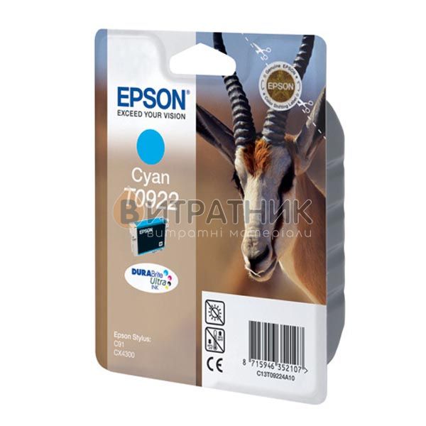 Этот струйный Картридж Epson Stylus C91/240/CX3400/T-26/27/TX106/109/117/119/T0922, Cyan выпускается компанией Epson, которая для создания таких расходных материалов использует собственное производство, разработки и технологии.