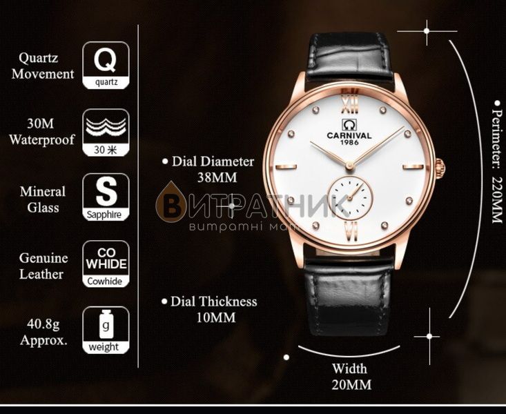 Стильные часы унисекс Carnival Modern сочетают в себе элегантность и классику. Минималистичный дизайн в тандеме с элементами роскоши позволит вам создавать на самом деле изысканные аутфиты. С таким аксессуаром вы будете чувствовать себя уверенно и в своей тарелке, будь то в вечернем платье или спортивном костюме, а может вообще в экстравагантной одежде. Каждый раз жестикулируя во время беседы, глаза окружающих будут следить за элегантными часами на вашем запястье. Ничего лишнего, только безупречный стиль с акцентом на равноправии покорит слушающую вас публику.