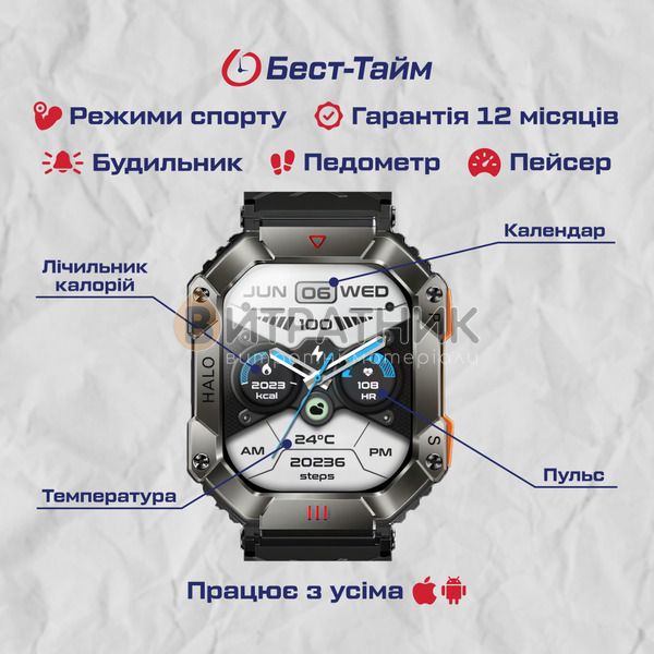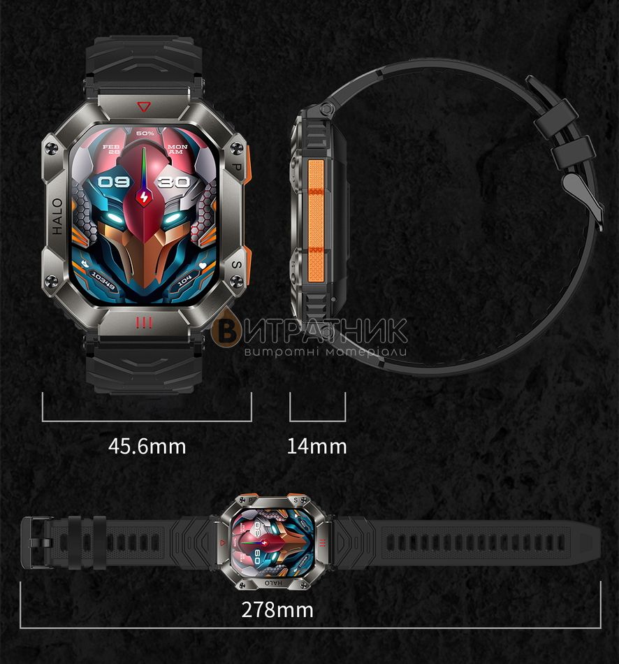 Smart Racer K+ – стильна новинка Uwatch з підтримкою української мови та компасом. Годинник призначений для альпіністів, військових і складних умов. Порівняно з попередніми версіями годинник має електронний компас, альтиметр, барометр, що стане в пригоді військовим й альпіністам. Також Smart Racer K+ має новий 2 дюймовий екран, величезну батарею на 650 МаЧ та оновлений дизайн. Вони мають безліч корисних функцій, міряють пульс, рівень висоти, оксиген і багато іншого. Також, цю модель високо оцінили любителі спорту, оскільки вона має розширений фітнес-трекер й безліч спортивних тренувань.В комплекті йде офіційна гарантія на 12 місяців.