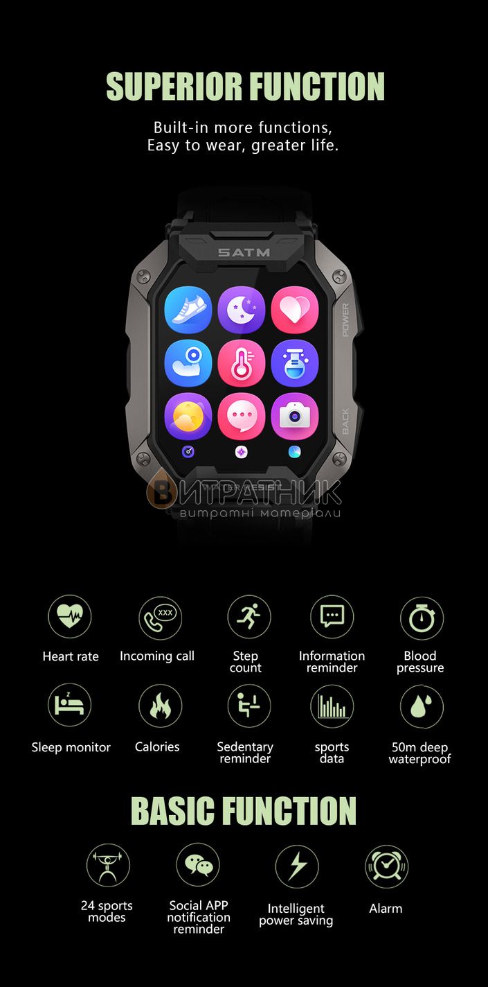 З інноваційним розумним годинником Smart UWatch Military кожний день може назавжди змінити ваше життя, адже з його допомогою ви матимете змогу створити достойні умови для нових досягнень і прагнень. Розширені функціональні можливості моделі зроблять вас максимально мобільними. Ви зможете дзвонити, надсилати повідомлення, моніторити останні новини, розважатися та слідкувати за станом свого здоров’я без зайвих зусиль. Лише піднесіть руку до себе, як це все стане можливим для вас у кілька кліків. Представлена на сайті нашого інтернет-магазину модель стане для вас незамінним помічником як в роботі, так і у подорожі. Займайтеся домашніми справами максимально продуктивно, а відпочивайте в горах чи на морі у своє задоволення.