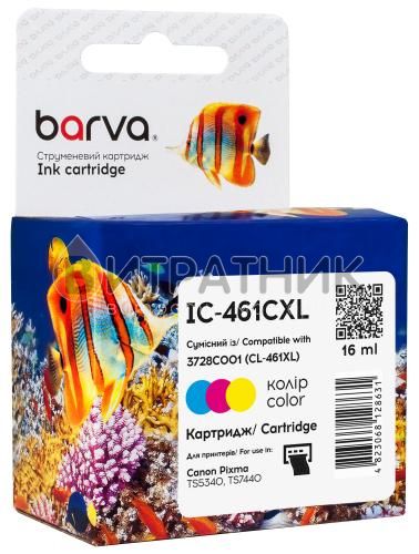 Картридж сумісний Canon CL-461 XL (3728C001) 300 арк, триколірний Barva (IC-461CXL) випускається компанією Barva, яка для створення таких витратних матеріалів використовує власне виробництво, розробки та технології.