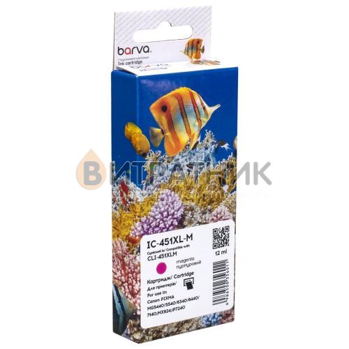 Картридж сумісний Canon CLI-451M XL (6474B001) 660 арк, пурпуровий Barva (IC-451XL-M) випускається компанією Barva, яка для створення таких витратних матеріалів використовує власне виробництво, розробки та технології.