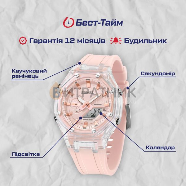 Функції:Подвійний час, 2 механізми, секундомір, будильник, підсвічування, дата, день тижня, місяць